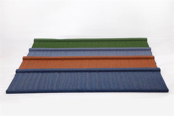 (1)基材:鍍鋁鋅鋼板 鍍鋁鋅鋼板的選擇對彩石金屬瓦的使用年限影響很大,博天牌彩石金屬瓦選擇時一般采用金色耐指紋保護膜,鍍鋅含量至少達到80克,板厚至少0.4mm,表層能明顯感覺到光滑面和鋅花,這樣瓦片不易生銹。